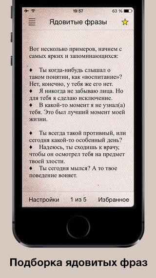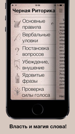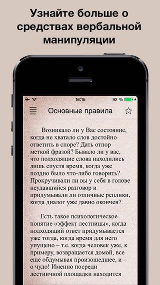 Временно бесплатно доступно приложение, которое поможет Вам отличать, в каком контексте и при каких вопросах ваши аргументы ничего не значат или, наоборот, являются решающими. А также устранить противоречия в разговоре с собеседником. Вы научитесь правильно использовать различные вербальные уловки, находчиво и элегантно устранить поставленные для Вас ловушки, в горячих спорах не терять головы и вести себя уверенно, выучите некоторые ядовитые фразы, а так же многое другое!