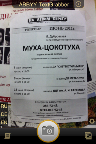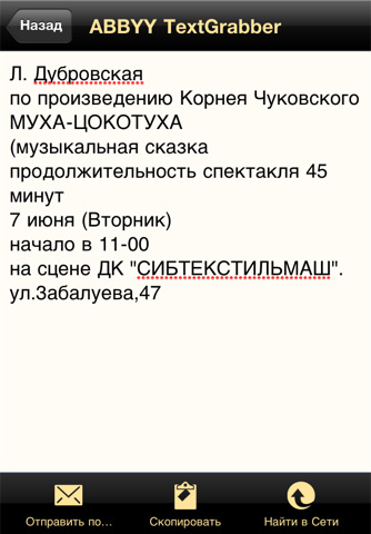 C приложением TextGrabber очень легко работать — достаточно просто сфотографировать интересующий вас фрагмент текста на любом печатном носителе, и через несколько мгновений вы сможете отредактировать его, скопировать через буфер обмена в другие приложения и сохранить, а также отправить по e-mail или SMS.