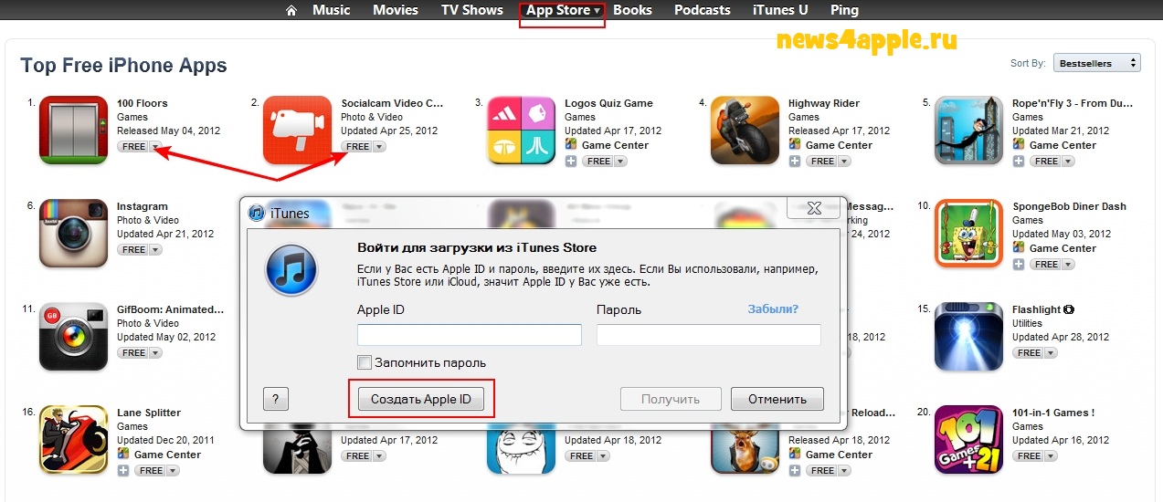 - 1)Переходим в AppStore. Находим справа «Free apps».Нажимаем-откроется список приложений. Кликайте на любое где видите надпись “Free” или “Бесплатные”. Далее в появившейся форме выбираем кнопку “Создать новый Apple ID” или «Создать новую учетную запись».