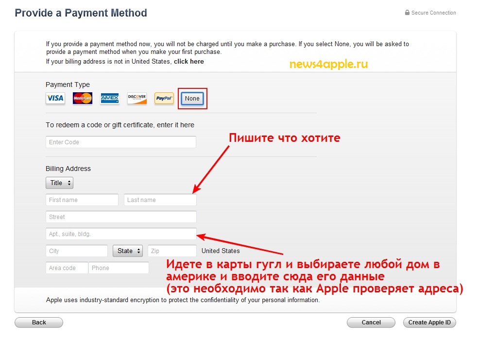 - 4)Выбираете метод оплаты — нет, ФИО — как хотите, дальше идете на http://maps.google.ru/ находите там США и смотрите адрес любого дома, и в соответствие заполняете поля регистрации. Все нажимаете далее, если вы все заполнили правильно, то скоро вам придет уведомление на почту. ВСЁ!!!
