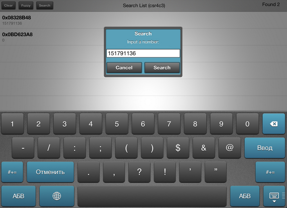9. Переходим в iGameGuardian, нажимаем кнопку «Search» и вводим значение, которое было на 8-ом шаге инструкции