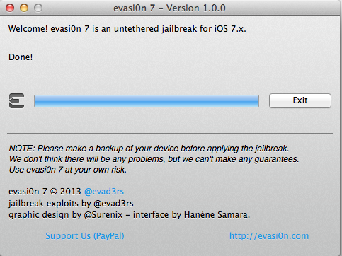 Через несколько минут в окне утилиты evasi0n7 появится надпись “Done!” –это значит что устройство начнет перезагружаться.