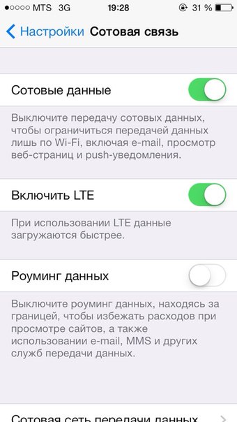 Последнее время меня мучал очень долгий интернет на iPhone 5c со связью МТС, почти постоянно стоял значок»E». Как-то в субботу вечером я возвращалась домой, пока шла по улице, набирала смс и обратила внимание на значок «LTE», появившимся вместо «E». Я подумала может это глюк, но он не исчезал, и моя смс по iMessage была отправлена за считанные секунды. Страницы в браузере загружались моментально. Придя домой я зашла в настройки «Сотовая связь» и обнаружила что теперь вместо «Включить 3G» стоит галочка «Включить LTE». При использовании LTE данные загружаются быстрее.