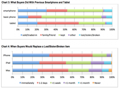 В прошлом году провели опрос среди 2 тыс. пользователей Apple iPhone, iPad и iMac, как показал опрос, владельцы iPad от Apple не так часто их меняют на более новую модель, как делают это владельцы iPhone. Многие владельцы iPhone переходят на новое поколение смартфона тогда, как только истечет их 2-х летний контракт. Данные опроса показали, что при потере или поломке iPhone, 8 из 10 владельцев приобретают уже в течении 2-х дней новый аппарат, а поломанный iPad заменён может быть только через неделю или даже позже.