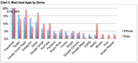 Так же сообщается, что потребители чаще всего пользуются совершенно разными приложениями на iPad и iPhone. Приложение Netflix является с самым большим разрывом в числе установок между пользователями iPhone и iPad. Меньше половины 1-ого % владельцев iPhone используют приложение Netflix, но зато среди владельцев iPad этим приложением пользуется около 10%. Так же на большом экране iPad более популярны такие приложения, как Safari, YouTube и Candy Crush Saga.