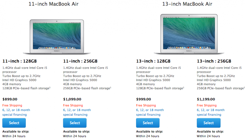 Поступил в продажу сегодня обновленный MacBook Air с усовершенствованным процессором Intel Haswell. Стоимость нового MacBook Air доступна пока только в американском онлайн-магазине Apple. Цена нового MacBook Air уменьшилась на 100 долларов, чем цена на предыдущую модель. Две версии нового MacBook Air, с 11- и 13-дюймовым дисплеем, поставляются с более быстрым двухъядерным процессором Intel Core i5 с частотой 1,4 ГГц и 4 ГБ оперативной памяти. Самая минимальная комплектация MacBook Air (128 ГБ встроенной памяти) обойдется в 899 долларов за модель с 11-дюймовым дисплеем и в 999 долларов за 13-дюймовый вариант. Модели с 256 ГБ встроенной памяти будут стоить 1 099 долларов и 1 199 долларов соответственно.