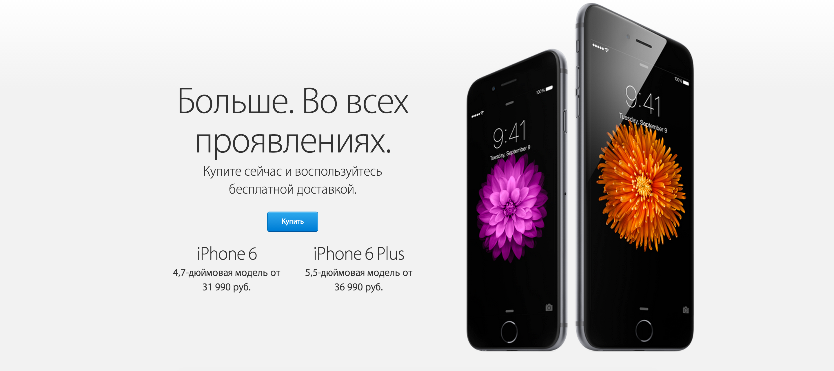 Таким образом, iPhone 6 цена которого на официальном сайте Apple в Росси составляла 31 990 руб. сейчас равняется 39 990 руб., а гаджет iPhone 6 Plus подорожал на целых 10 000 руб.